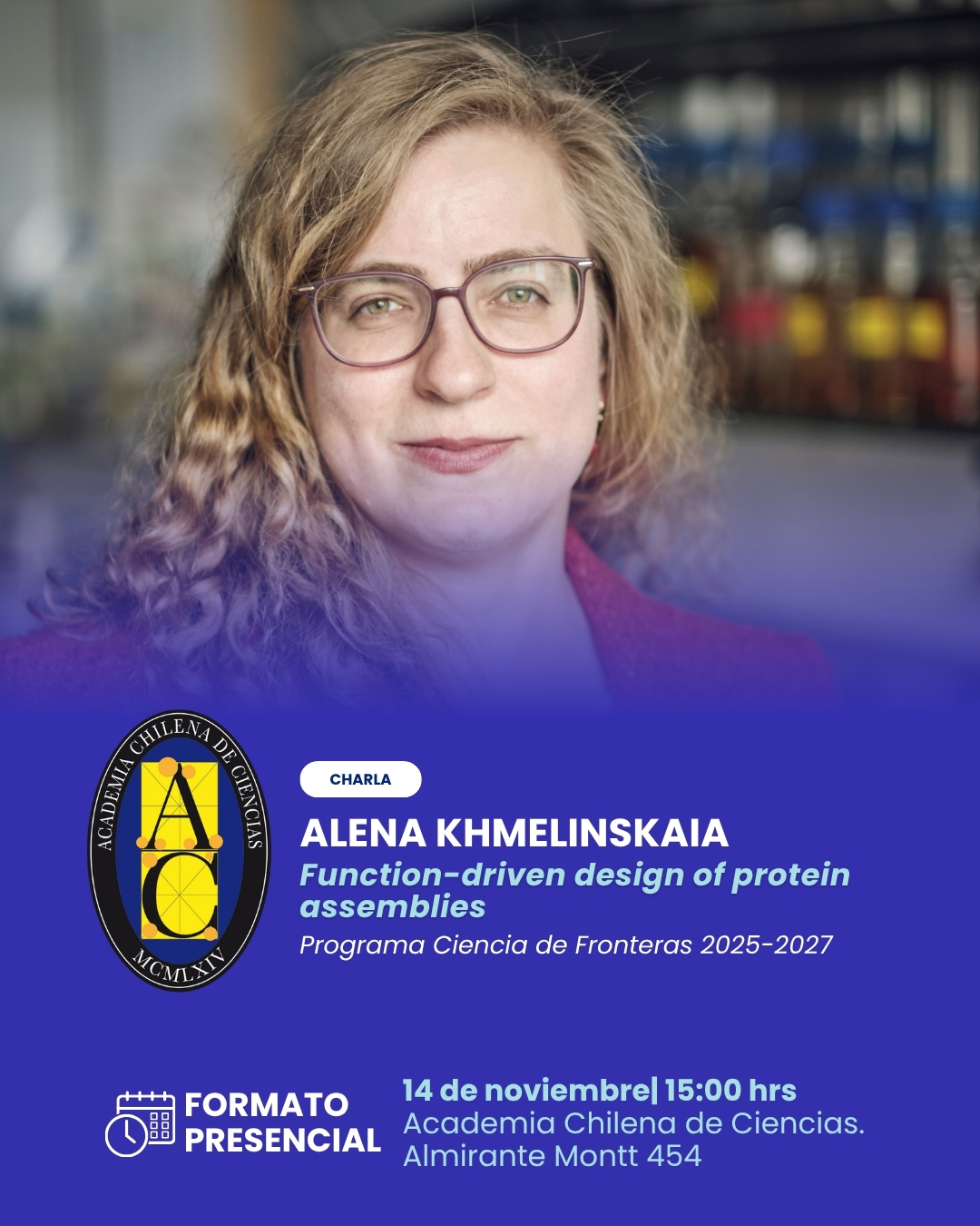 El comité de Ciencia de Frontera de la Academia Chilena de Ciencias tiene el agrado de invitarles a participar de manera presencial o virtual de la charla de Alena Khmelinskaia (LMU Múnich), titulada “Function-driven design of protein assemblies”, a realizarse el próximo viernes 14 de noviembre a las 15 h en la sede del Instituto de Chile (Almirante Montt 453, frente a la Academia Chilena de Ciencias).